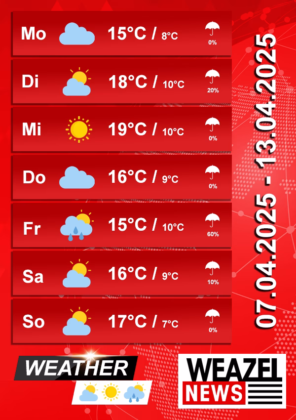 Die Woche startet grau, wird zur Wochenmitte sonniger, bevor es zum Wochenende wieder wechselhaft wird. Temperaturen pendeln sich zwischen 8 und 19 Grad ein. Mit einzelnen Schauern ist zu rechnen – besonders am Dienstag, Freitag und Samstag. Die Sonne zeigt sich immer wieder, aber die Regenjacke sollte griffbereit bleiben.