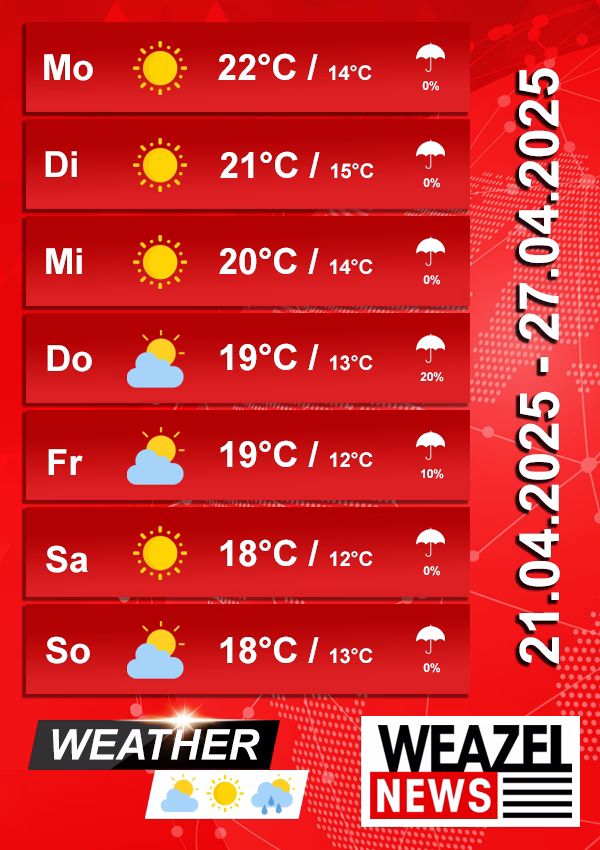 Die neue Woche beginnt freundlich: Am Montag dürfen wir uns über 22 Grad und Sonnenschein freuen. Im Laufe der Woche sinken die Temperaturen langsam, bleiben mit rund 18 Grad aber weiterhin angenehm.