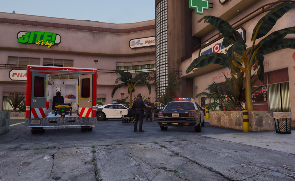 Noch während der Schüsse trafen bereits alarmierte Beamte am Tatort ein. Die Beamten gingen sofort gegen den bewaffneten Eigentümer vor und eröffneten ebenfalls das Feuer, um die Gefahrensituation unter Kontrolle zu bringen. Der Ladenbesitzer wurde dabei verletzt, konnte jedoch nach der Sicherung des Tatortes durch die Einsatzkräfte an die Beamten vom LSFD übergeben und per Helikopter ins Krankenhaus abtransportiert werden.