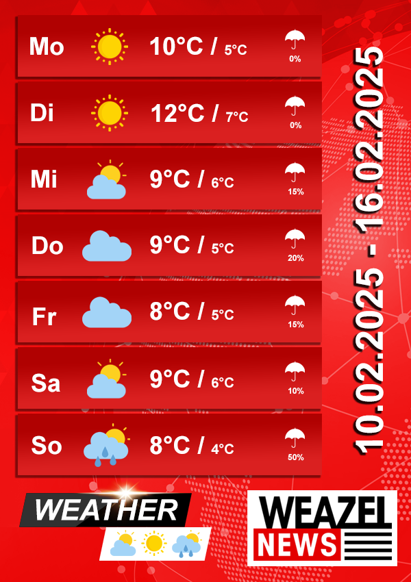 Es ist eine Woche mit freundlichen und vergleichsweise warmen Winterbedingungen, ideal für Aktivitäten im Freien, besonders an den sonnigen Tagen zu Wochenbeginn. Richtung Wochenende sind leichte Regenschauer möglich, aber kein anhaltender Regen.
