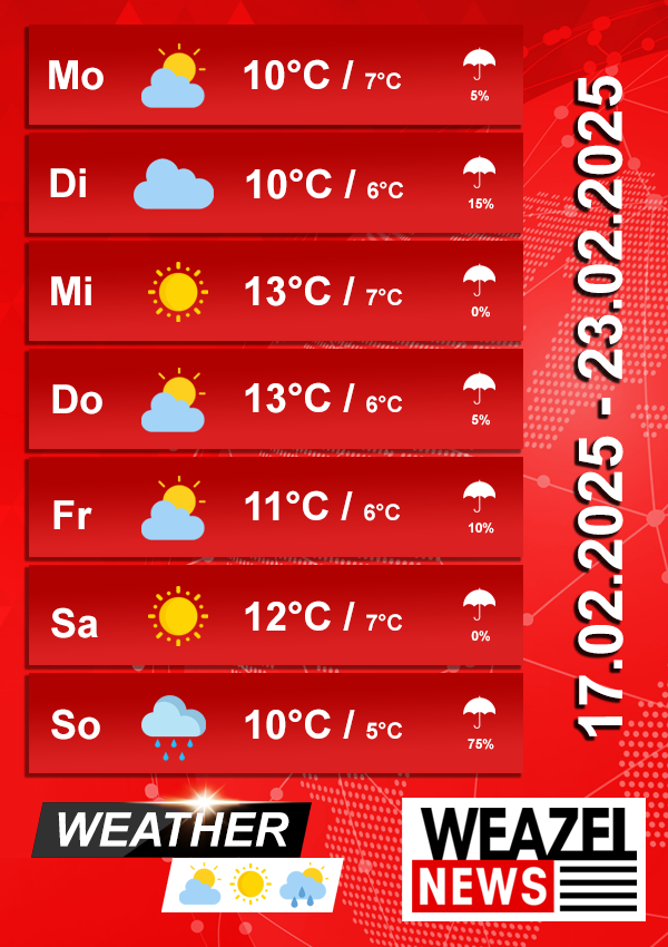 Am Wochenende steigt die Regenwahrscheinlichkeit wieder an, insbesondere am Sonntag, an dem mit Niederschlägen zu rechnen ist. Trotz vereinzelter Regentage bleibt das Wetter insgesamt angenehm und bietet einige sonnige Abschnitte, die sich ideal für Aktivitäten im Freien eignen.